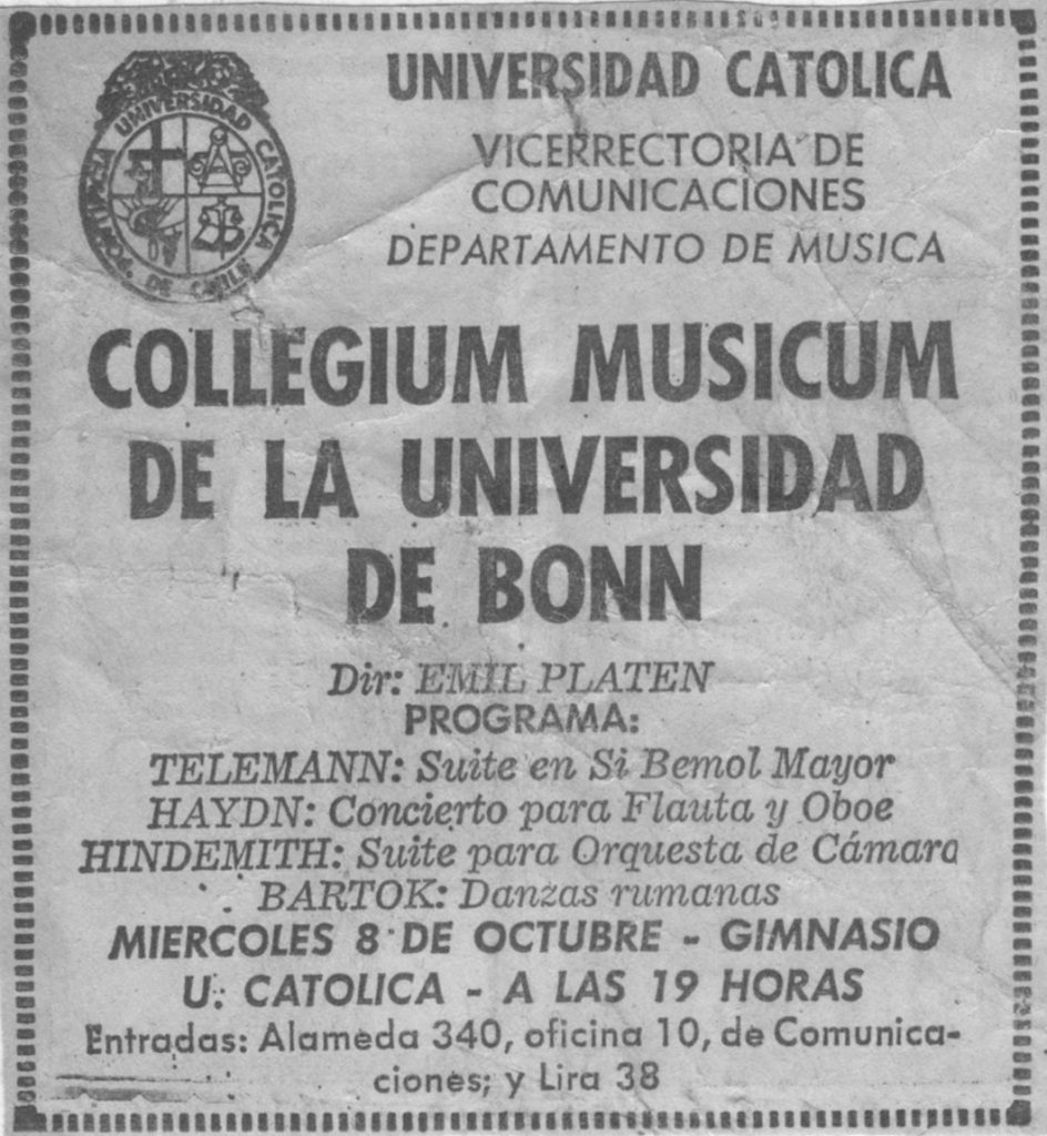 08.10.1969 Konzert in der Universidad Catolica Santiago de Chile Collegium musicum Tonarchiv Georg Philipp Telemann: Ouverture B-Dur TWV 55:B1,1. OuvertureGeorg Philipp Telemann: Ouverture B-Dur TWV 55:B1, 2. Bergerie (un peu vivement)Georg Philipp Telemann: Ouverture B-Dur TWV 55:B1, 3 PostillonsGeorg Philipp Telemann: Ouverture B-Dur TWV 55:B1, 4. FlaterieGeorg Philipp Telemann: Ouverture B-Dur TWV 55:B1, 5. MenuetGeorg Philipp Telemann: Ouverture B-Dur TWV 55:B1, 6. ConclusionJoseph Haydn: Konzert für Flöte Oboe und Orchester G-Dur, 1. Allegro con spiritoJoseph Haydn: Konzert für Flöte Oboe und Orchester G-Dur, 2. Romance. AllegrettoJoseph Haydn: Konzert für Flöte Oboe und Orchester G-Dur, 3. Finale. Tempo di MenuettoPaul Hindemith: Fünf Stücke für Streichorchester op. 44, 1. LangsamPaul Hindemith: Fünf Stücke für Streichorchester op. 44, 2. Langsam - SchnellPaul Hindemith: Fünf Stücke für Streichorchester op. 44, 3. LebhaftPaul Hindemith: Fünf Stücke für Streichorchester op. 44, 4. Sehr langsamPaul Hindemith: Fünf Stücke für Streichorchester op. 44, 5. LebhaftBéla Bartók: Rumänische Volkstänze, Jocul cu bataBéla Bartók: Rumänische Volkstänze, BraulBéla Bartók: Rumänische Volkstänze, Pe locBéla Bartók: Rumänische Volkstänze, BuciumeanaBéla Bartók: Rumänische Volkstänze, Poarga romanescaBéla Bartók: Rumänische Volkstänze, MarunelBéla Bartók: Rumänische Volkstänze, Maruntel