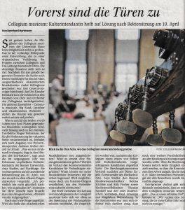 Ab dem 1. April dürfen die Mitglieder des Collegium musicum die Probenräume und die Aula nicht mehr betreten. Die Schlüssel mussten abgegeben werden, und die Schlösser zu den Räumen des Collegium musicum wurden ausgetauscht.