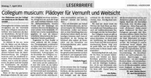 Betrifft: Leserbrief zum Feuilletonbericht vom 2.4. zum Collegium Musicum