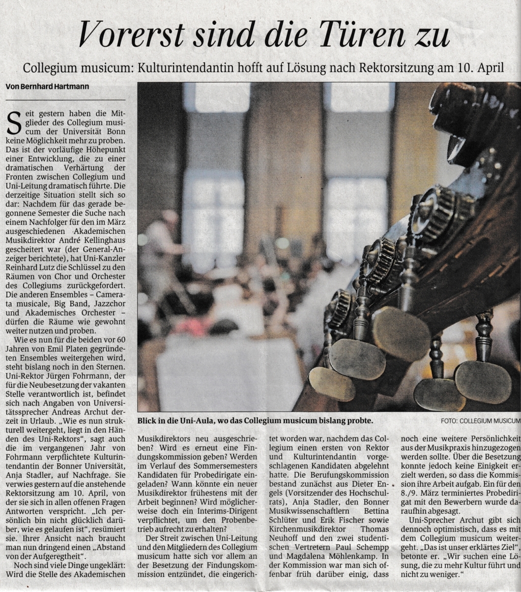 Bericht des Bonner General-Anzeigers über die drohende Schließung des Collegium musicum.