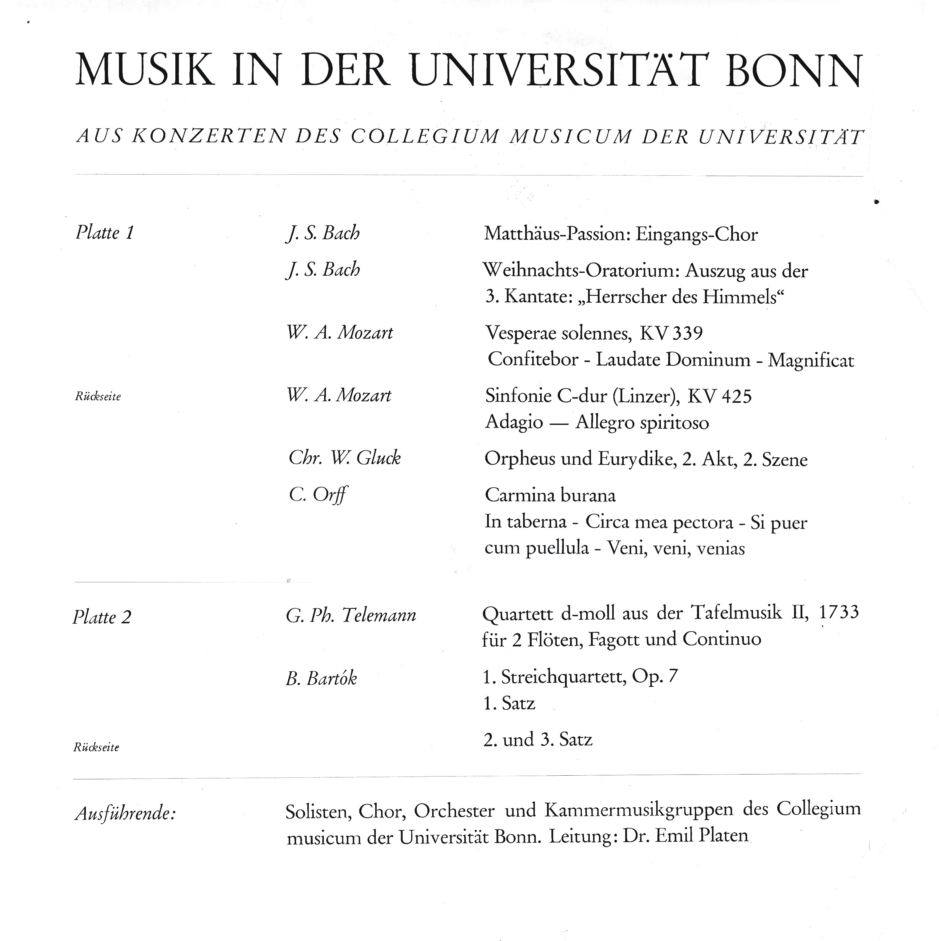 Aus Anlass des 150. Jahrestages der Gründung der Rheinischen Friedrich-Wilhelms-Universität zu Bonn im Jahre 1968 erschien eine erste Schallplatte mit Aufnahmen aus Konzerten des Collegium musicum.